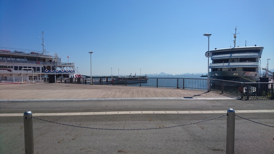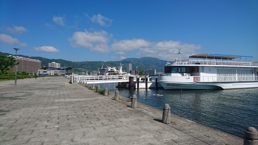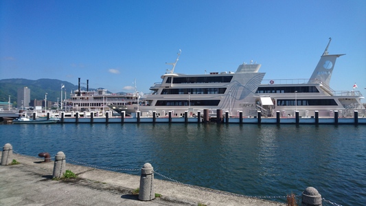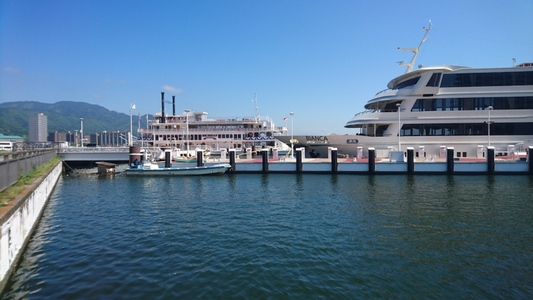 滋賀県大津市の大津港(浜大津港) 手前は遊覧船「ビアンカ」、その向こうに遊覧船「ミシガン」 琵琶湖汽船公式ホームページ|ミシガンビアンカ-滋賀県 |