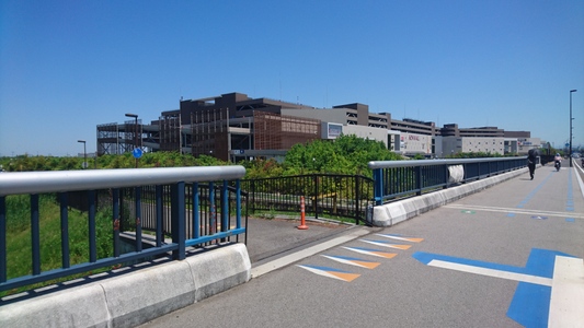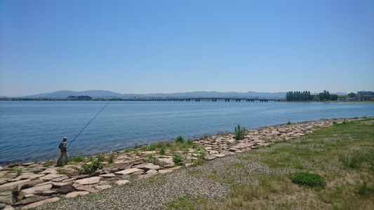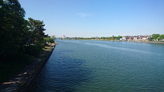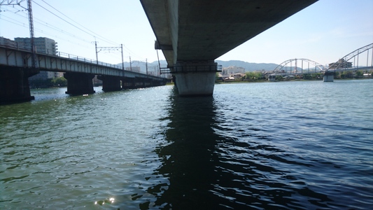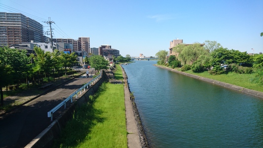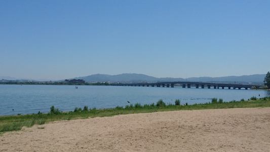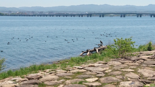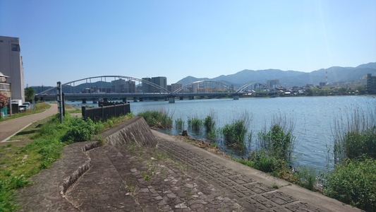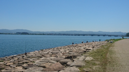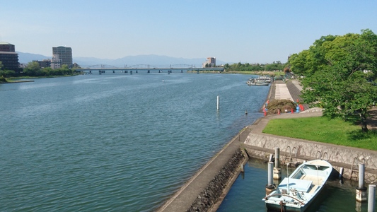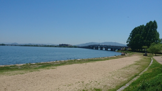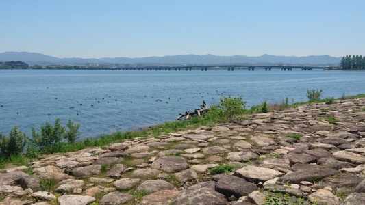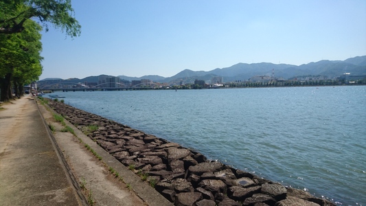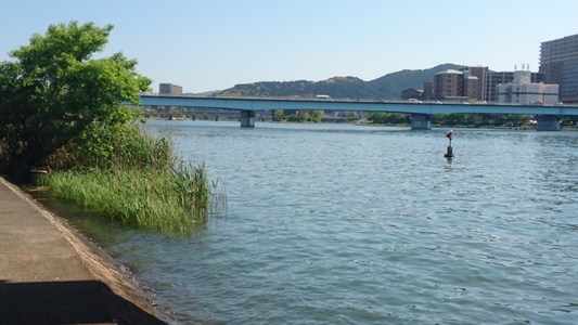 瀬田川、川岸沿いに「瀬田の唐橋」に向かう あちら琵琶湖方面に見えるは近江大橋 |