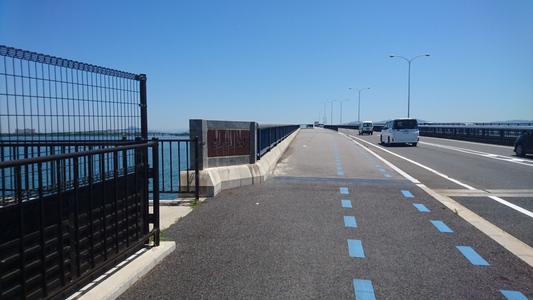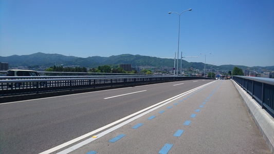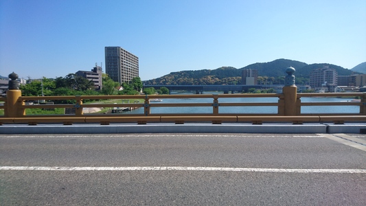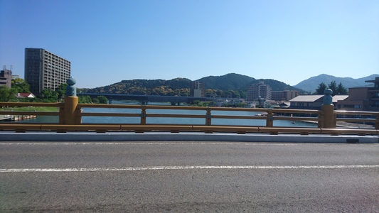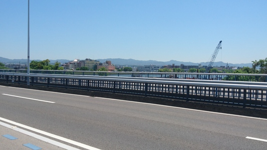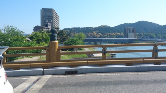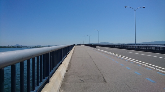 「瀬田唐橋」を渡る、彼方に見えるは琵琶湖に架かる近江大橋 |