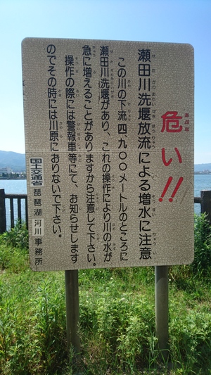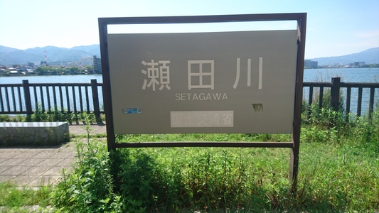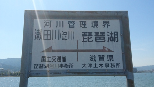 瀬田川、川岸沿いに「瀬田の唐橋」に向かう 河川管理境界、左は瀬田川(淀川) 国土交通省・右は琵琶湖 滋賀県 |