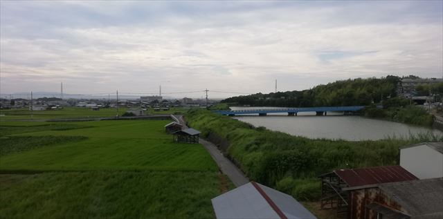柱の向こうにも小さく 琵琶湖大橋が ビワイチ 琵琶湖一周サイクリング は湖岸沿いの道路を走るも 今は幾分内陸部を これも又、いい経験なり |