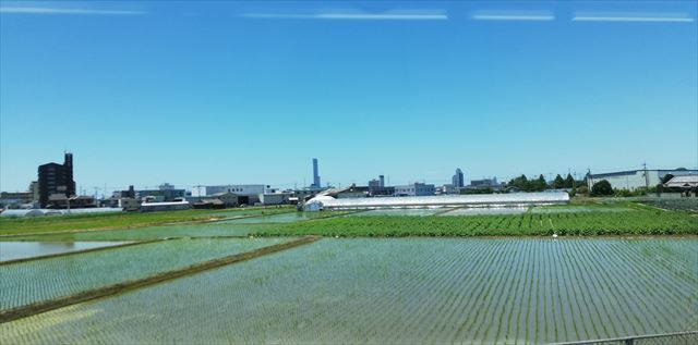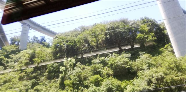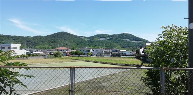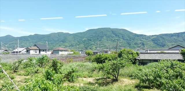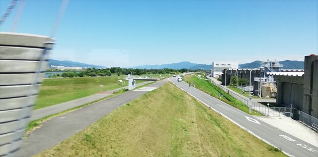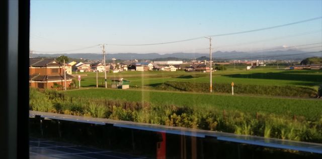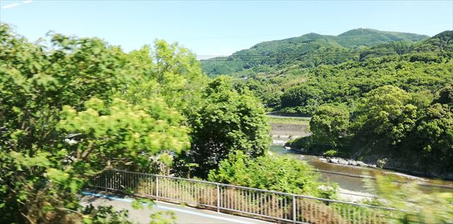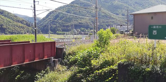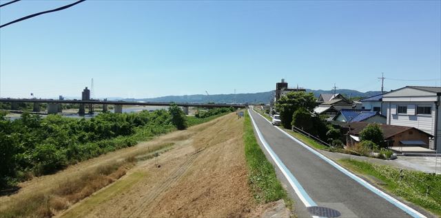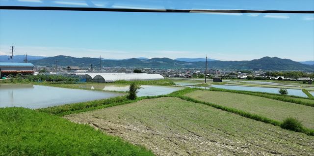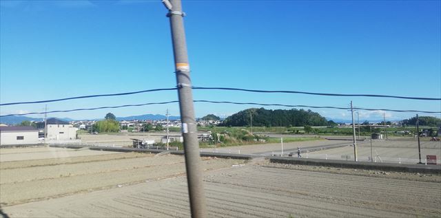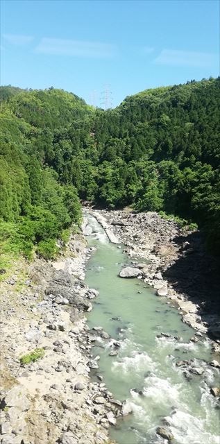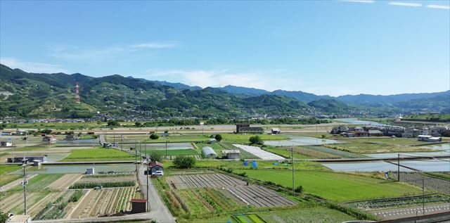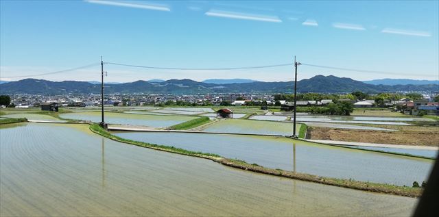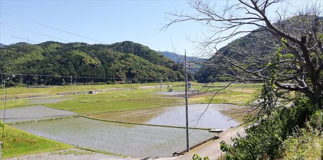 ![]() 電柱・水田の先には、保津峡谷・・保津川下り が・・・ |