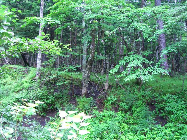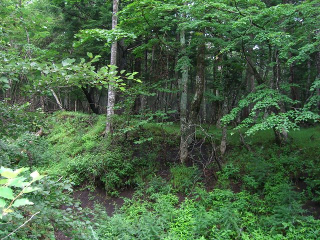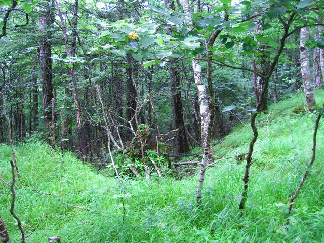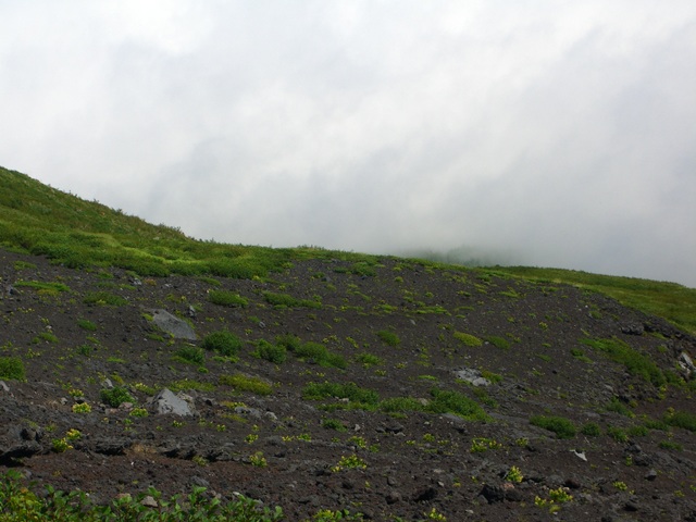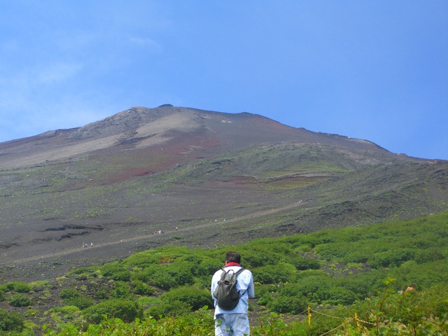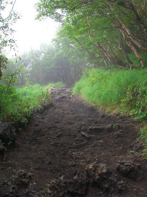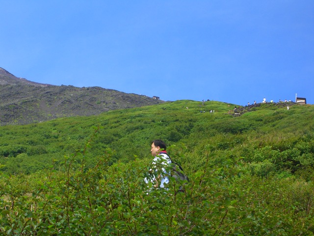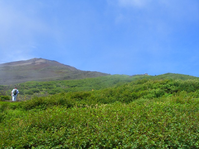 六合目の長田山荘の手前から、皆さんは休憩中も当方は軽装で前へ進む |