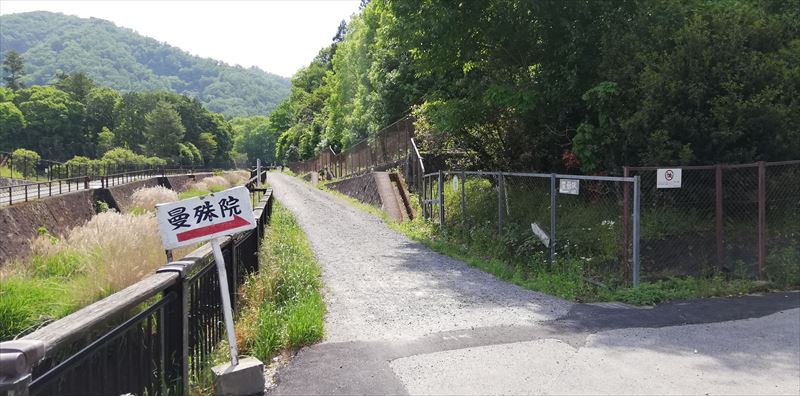![]() 曼殊院と読めるが、頼りになるは向こうのフェンスの小さな標識 |
