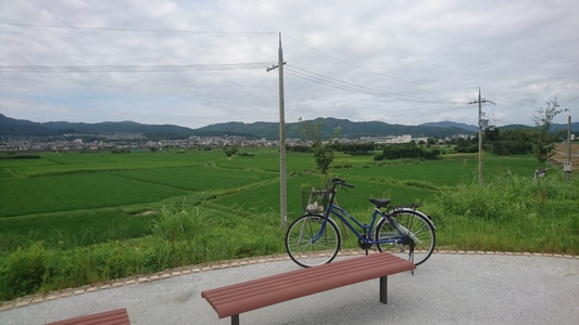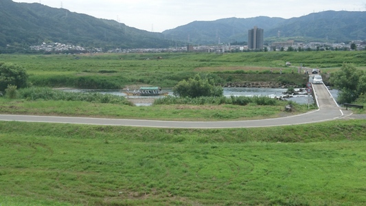後輪の先、山々の合間・・少し低くなった辺りを保津川下りの遊覧船は