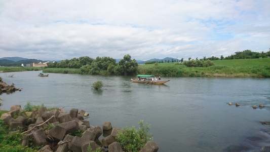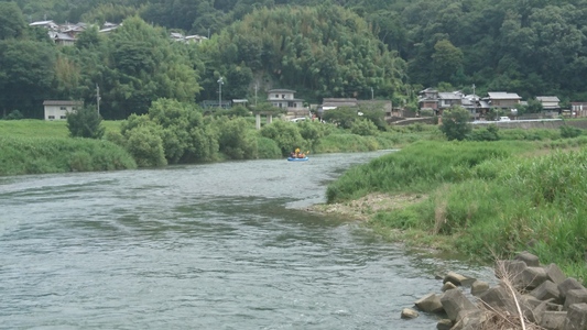 保津川(桂川)をラフティングが行く、あちら側は亀岡市内の保津町