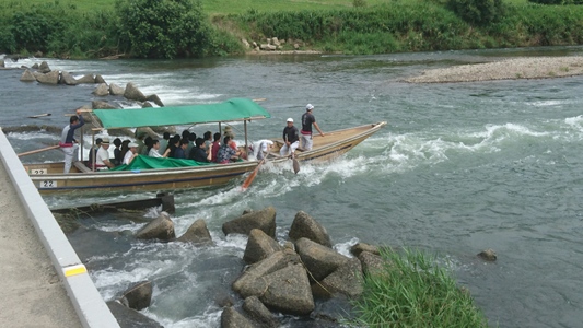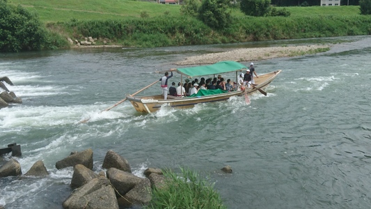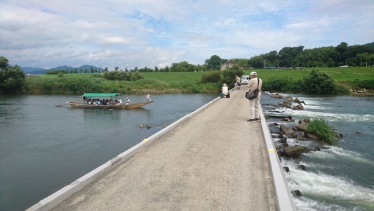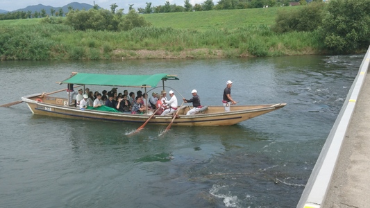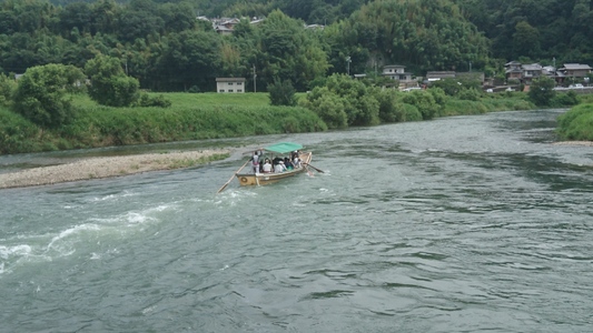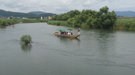 保津川下りを楽しむ人々、高瀬舟?から遊覧船に?