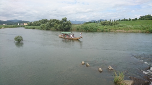 保津川下りの遊覧船、対岸の彼方は京都府亀岡市保津町