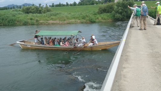 先生役の方がご指導される。 向こうから車が来たらクルマも遊覧船もシーンに