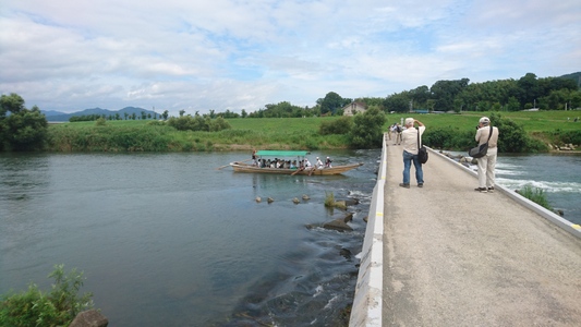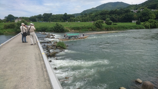 橋上のカメラ同好会?の方が手を振ると保津川下りを楽しむ乗客も