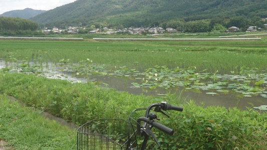 自転車 蓮 稲、そして見え難いでしょうが白鷺が一羽・・