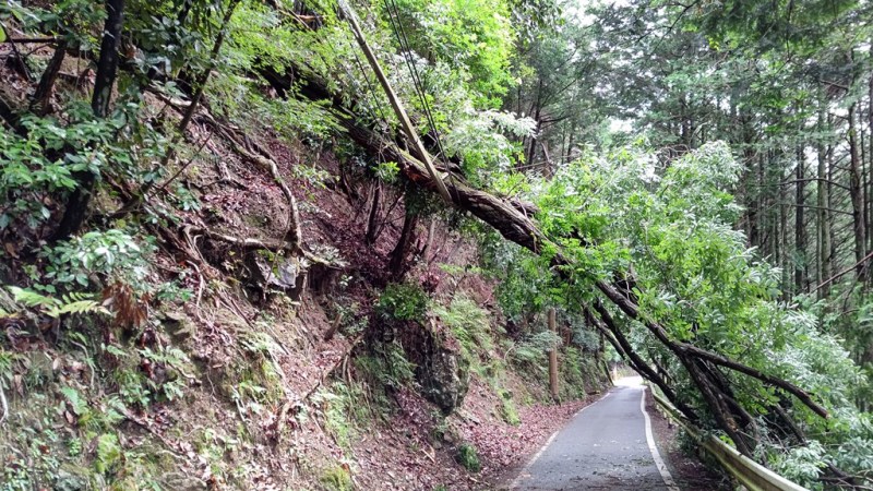 ![]() 送電線とガードレールにも支えられた倒木あり |