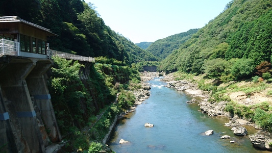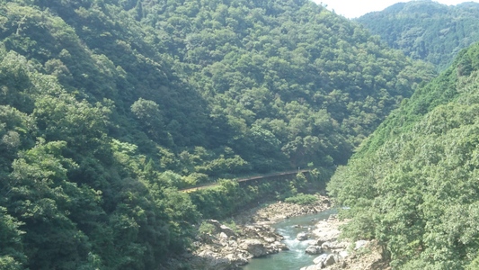 JR嵯峨野線(山陰本線)、保津峡駅より桂川を臨む(向こうは京都市) |