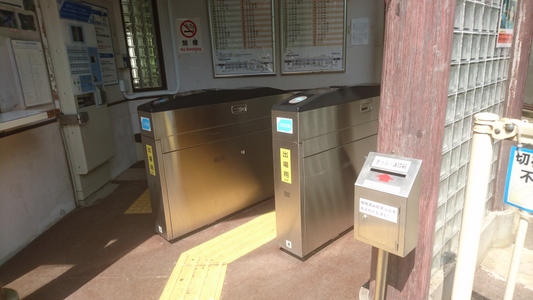 JR嵯峨野線(山陰本線)、保津峡駅の改札口 あっICOCA使えたんだ。まさかICOCA対応だとは知らなんだ 亀岡駅でICOCAで買った切符は右側の小さな箱へ投入 因みに後でネットで調べたら「改札口コールシステム」利用可らしい |