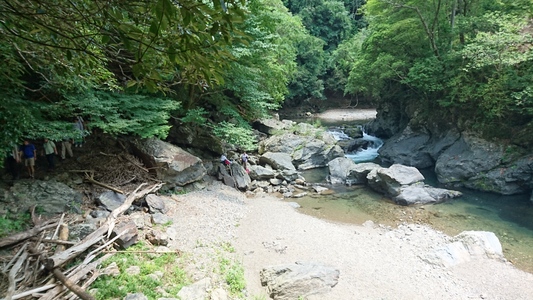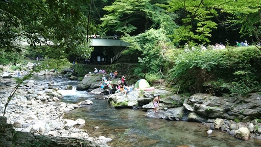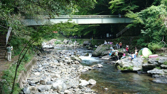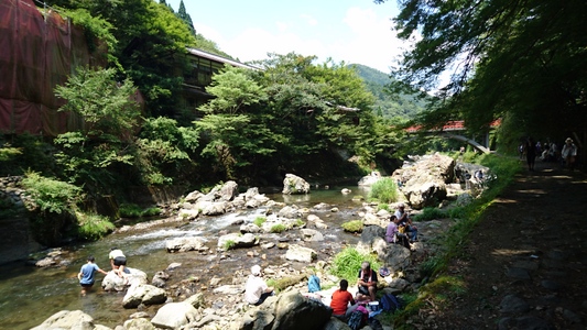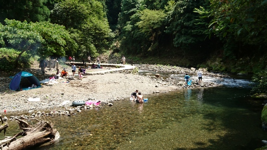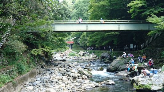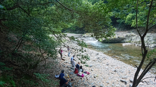 河原で清流が流れる渓谷の美しき風景を存分に楽しむ方々 |