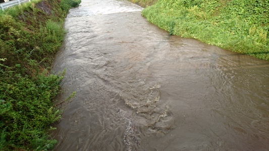 帰宅直前に局地的な通り雨?それにしても結構長かった 近くの空を見上げると日差しは強烈そうだったが・・・ そのせいで川も濁流に・・・ |
