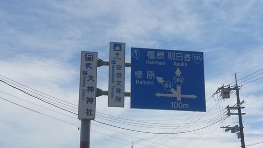 100m先の交差点、国道169号線を直進すると橿原 明日香(国道165号線) 左斜め方向は国道169号線で榛原方面へ 以前に祈願した阿部文珠院まで4.4Km、 大神神社(おおみわじんじゃ)は左斜め方向へ |