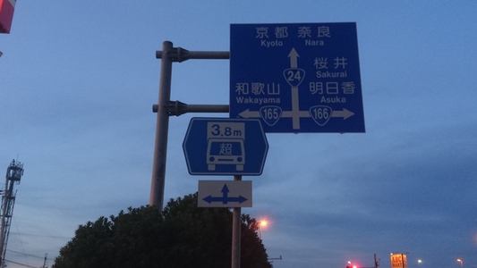 次の交差点を直進は国道24号線経由で京都・奈良方面へ 左折は国道165号線経由で和歌山へ、右折は国道166号線で桜井・明日香へ |