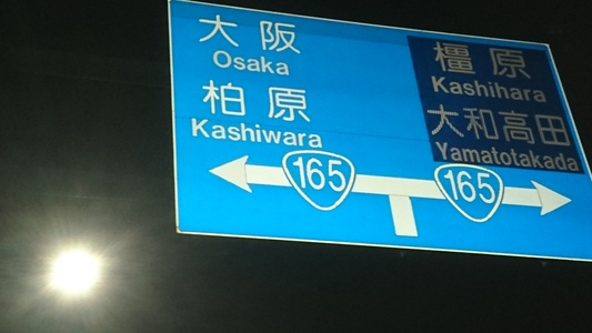 交差点を左折は国道165号線経由、大阪・柏原(Kashiwara)へ 右折は国道165号線経由、大和高田・橿原(Kashihara)へ |