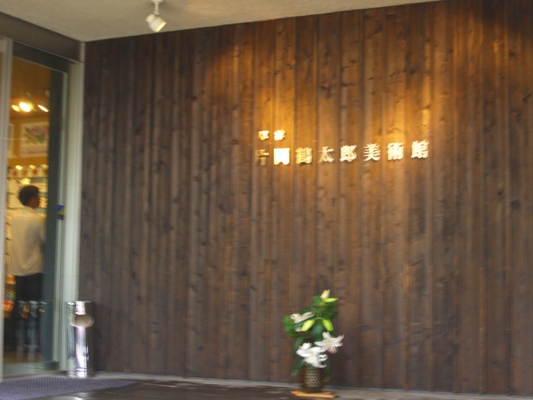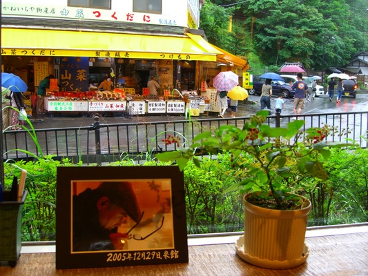 かねいち屋山菜佃煮店を前にして片岡鶴太郎美術館のカフェコーナーで |