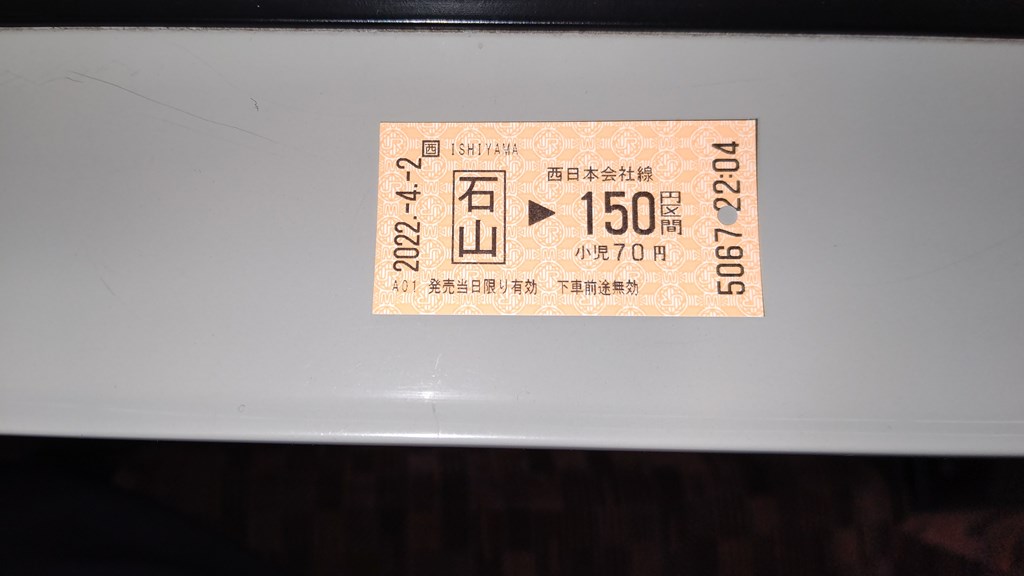 ![]() 大分前から棒の様になった両足をこき使ってJR石山駅にやっと到着!連絡が気になり取り敢えず最小区間切符 22:04 最終のJR亀岡駅にて清算 確か土曜ダイヤ 22:07発に乗車 20220402_2246 (備忘録として切符購入時刻を・・) |